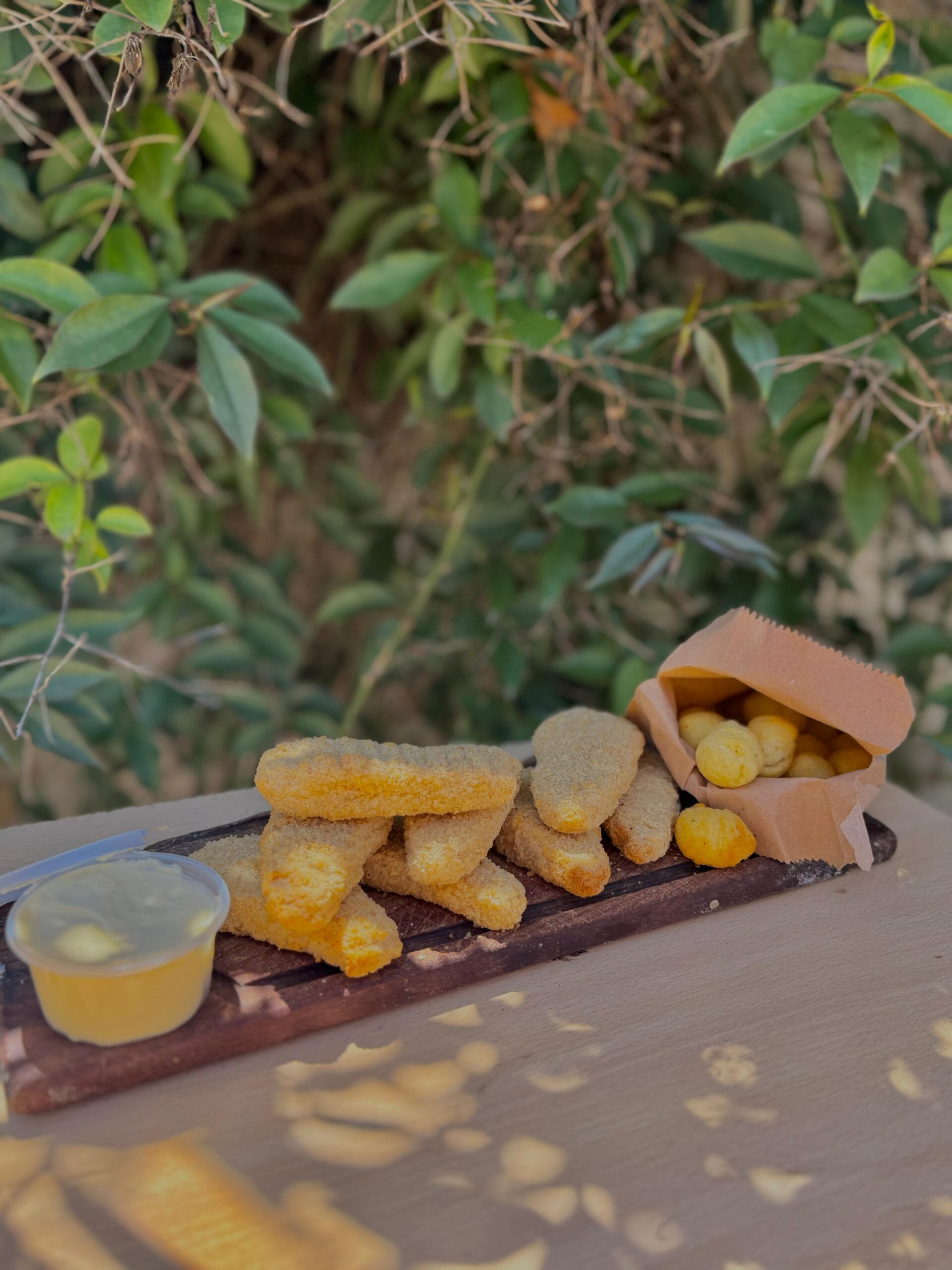 TROCITOS DE MILANESA POLLO CON ADEREZOS Y LIMON PAPAS NOISETTE